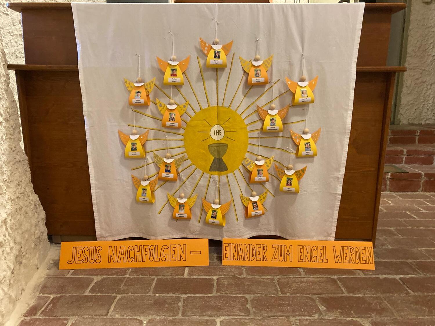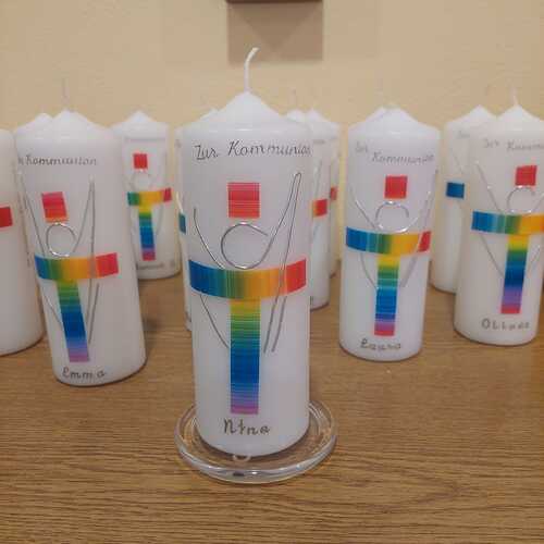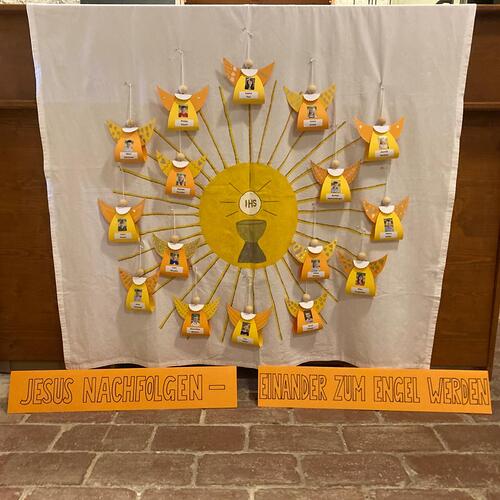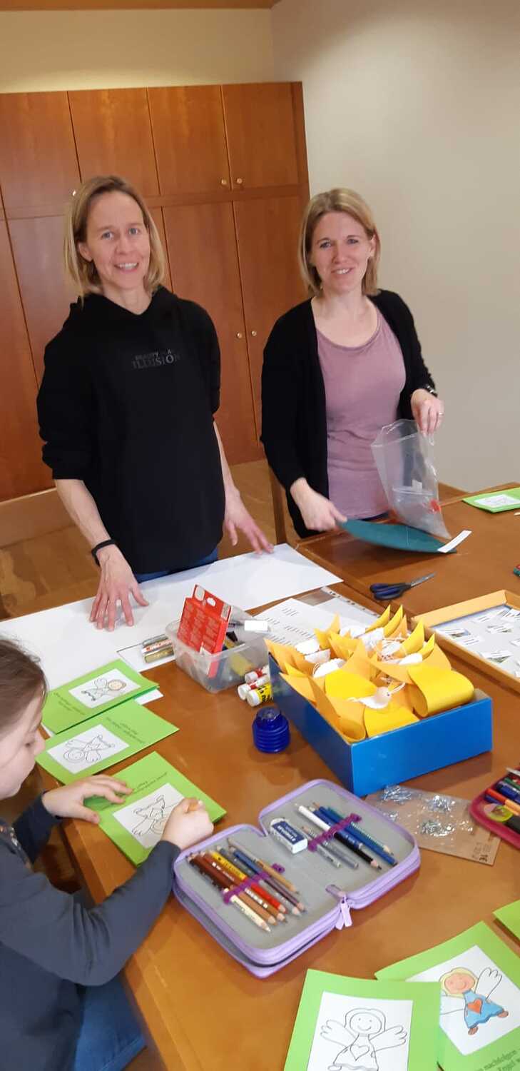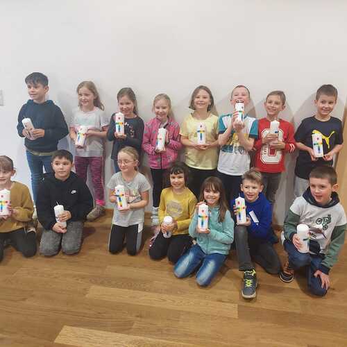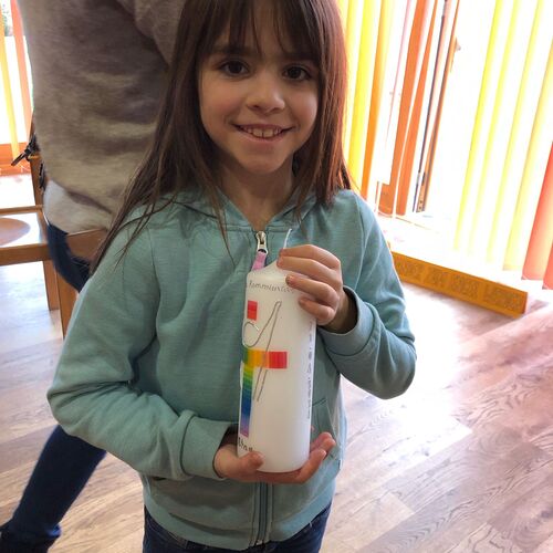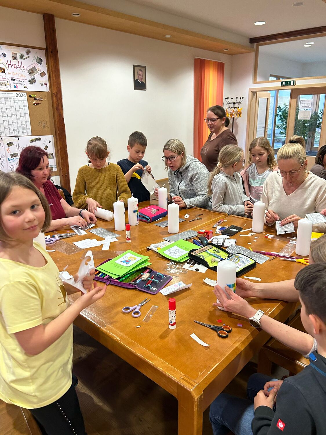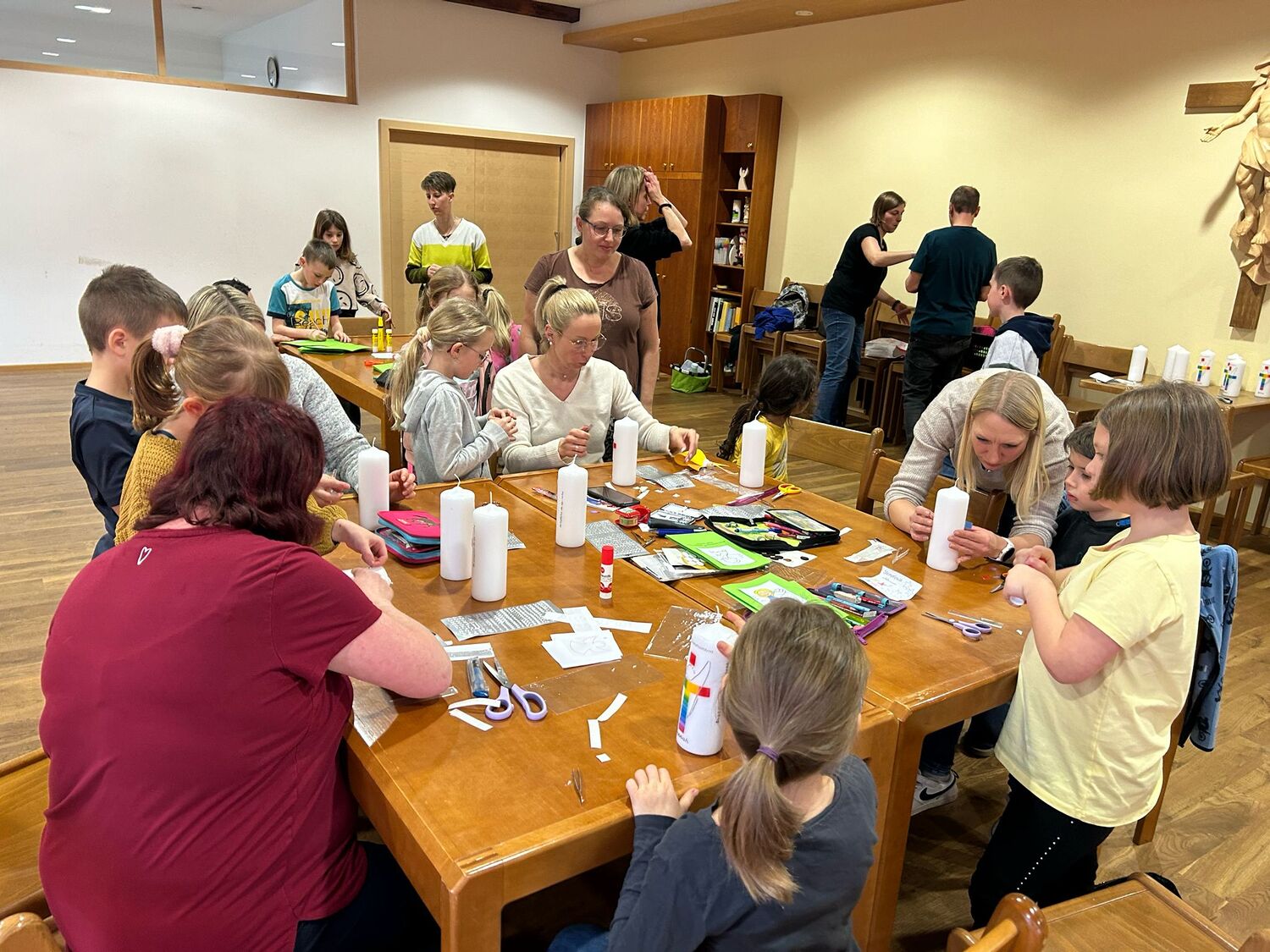 Gemeinsam mit einigen Eltern gestalten die Erstkommunionkinder ihre Erinnerungskerze und das Altartuch.