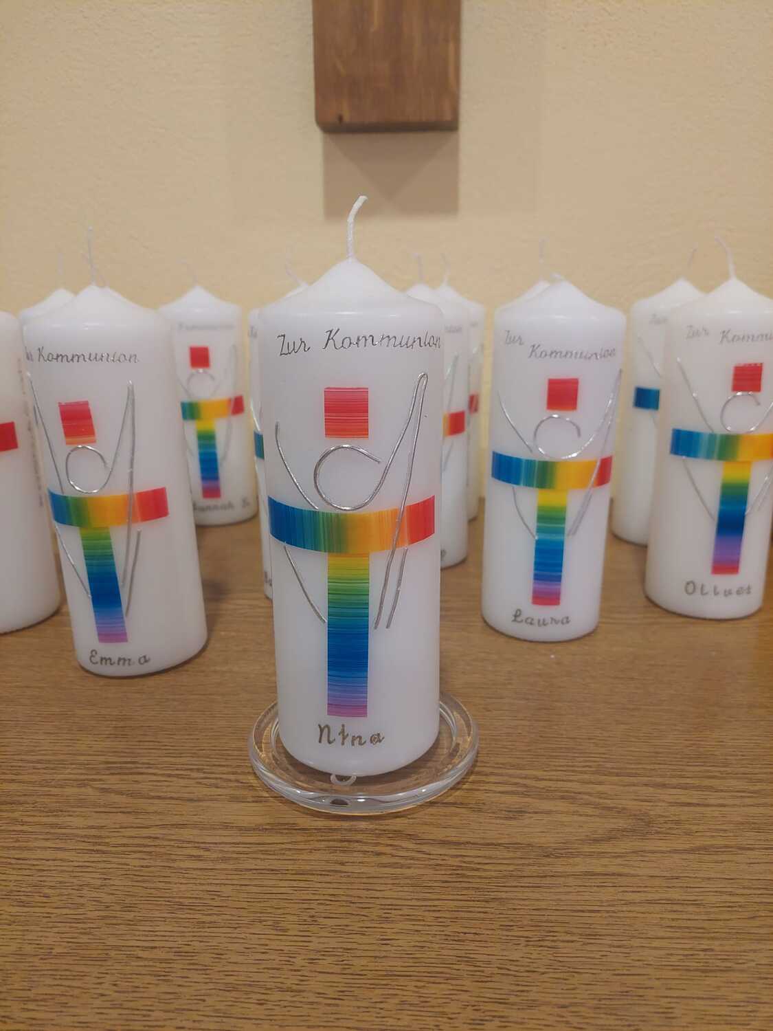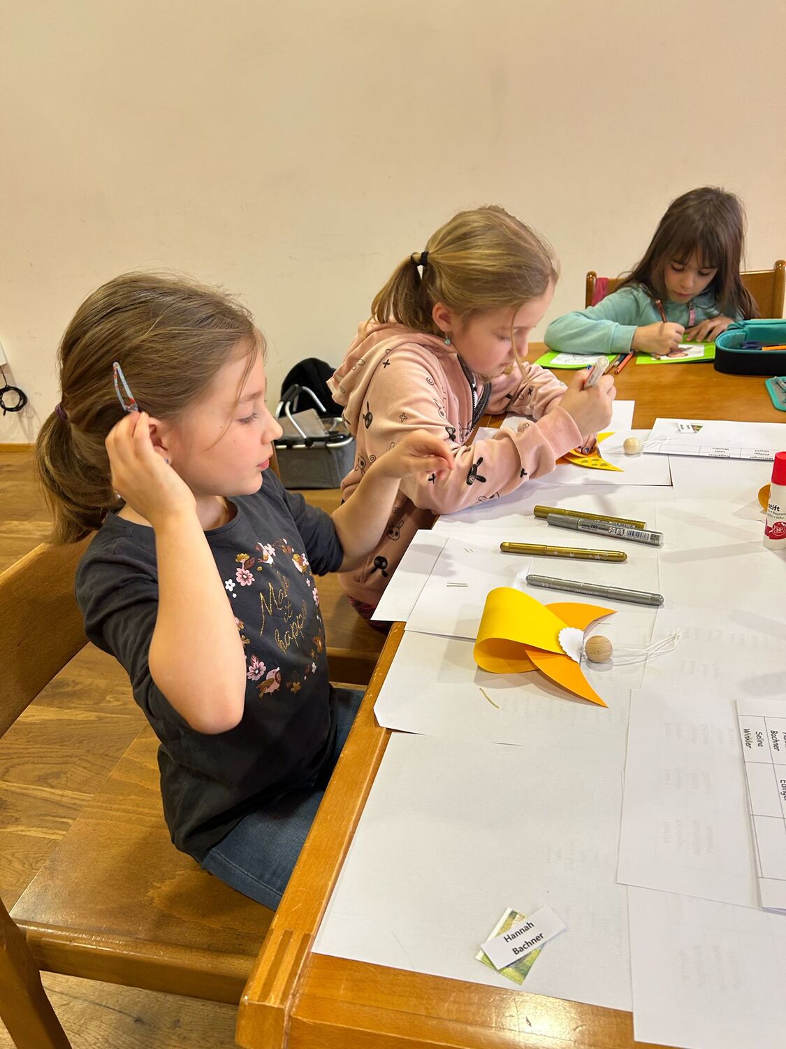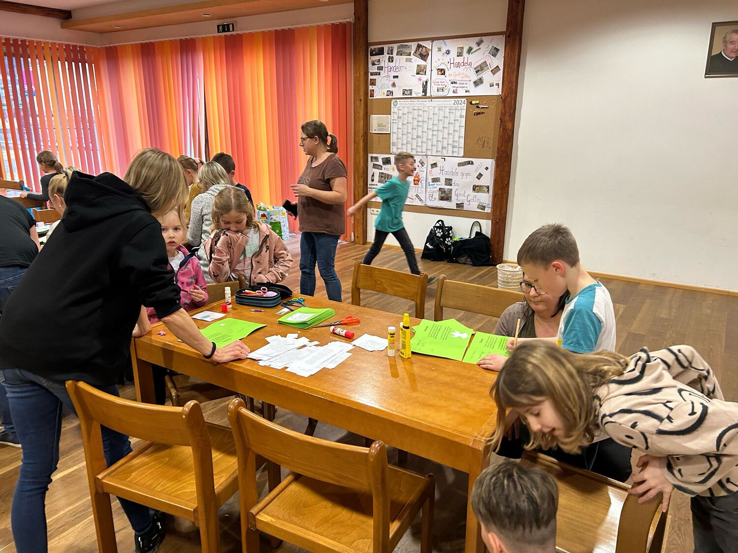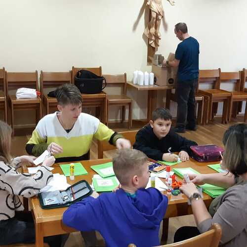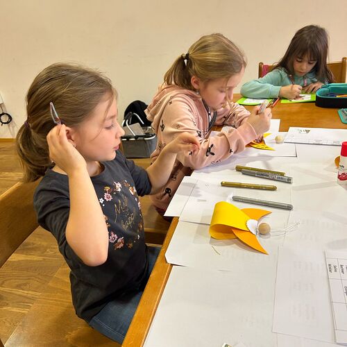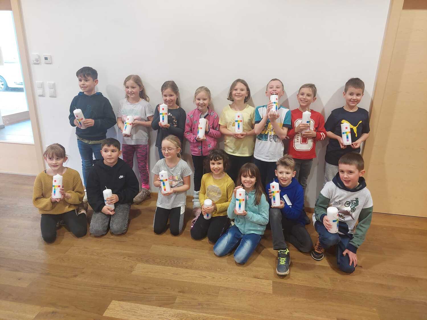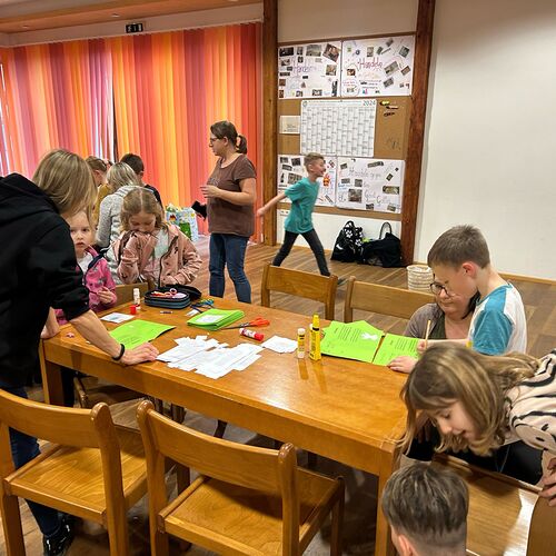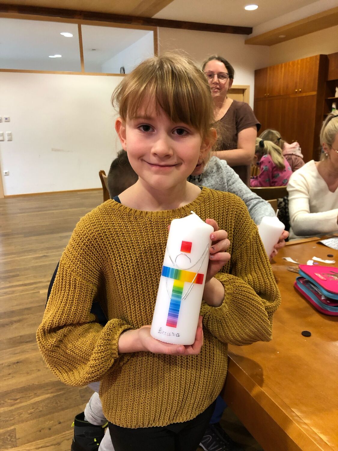 Gemeinsam mit einigen Eltern gestalten die Erstkommunionkinder ihre Erinnerungskerze und das Altartuch.
