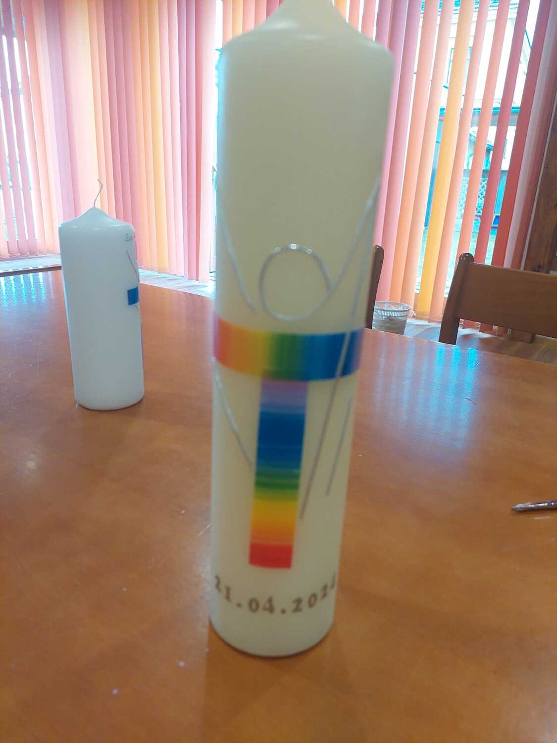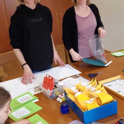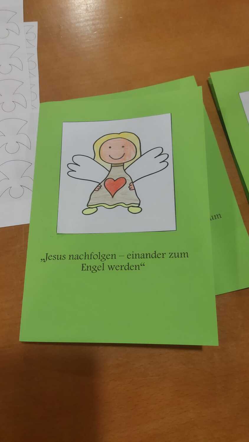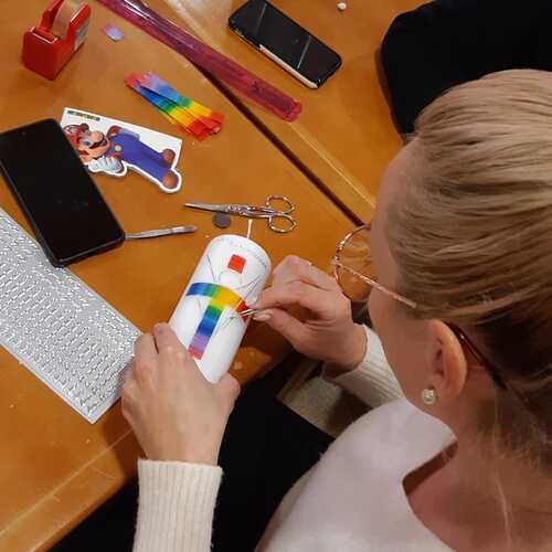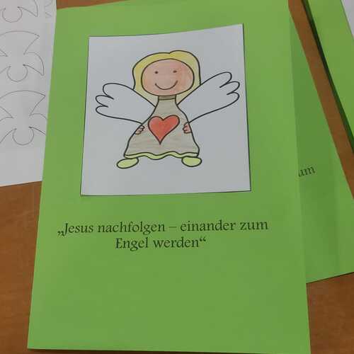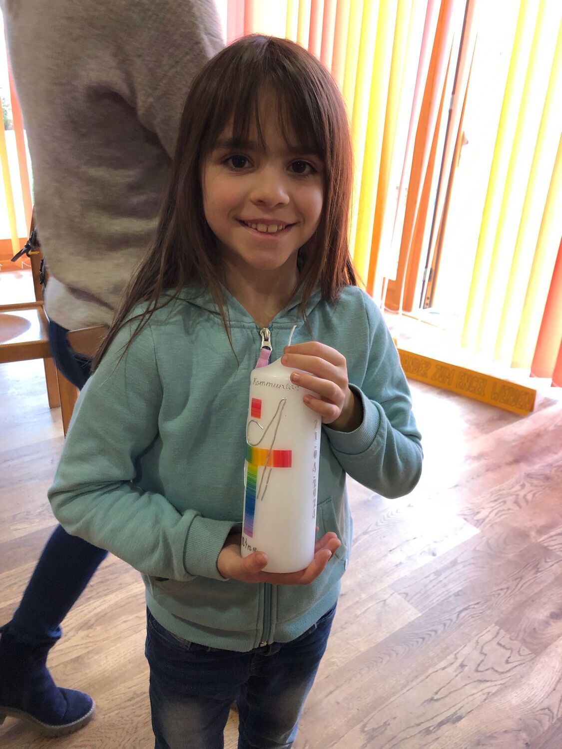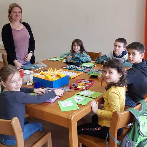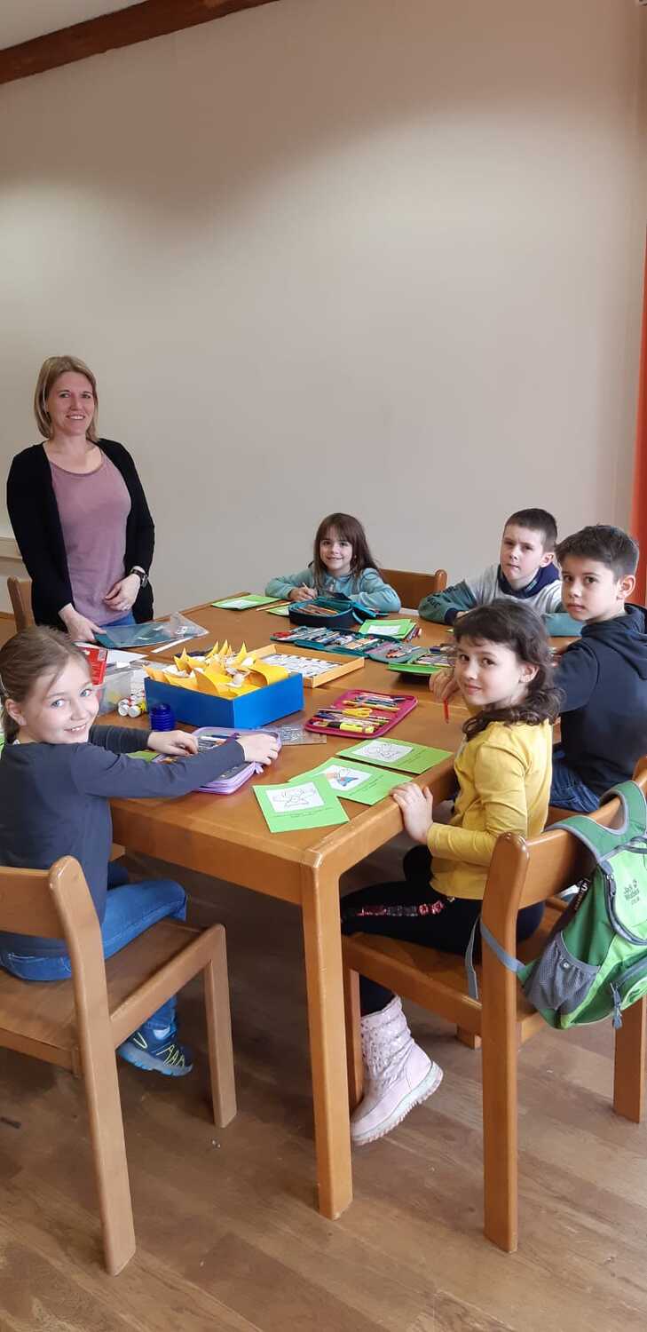 Gemeinsam mit einigen Eltern gestalten die Erstkommunionkinder ihre Erinnerungskerze und das Altartuch.