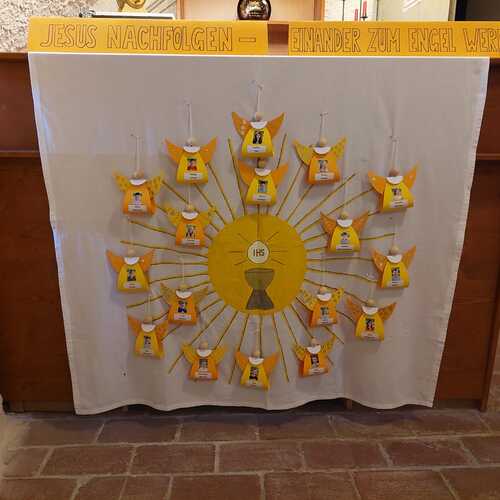 Erstkommunionvorbereitung 1. Treffen Gemeinsam mit einigen Eltern gestalten die Erstkommunionkinder ihre Erinnerungskerze und das Altartuch. Danke an alle fleissigen Helfern zu den Bildern: Erstkommunionvorbereitung