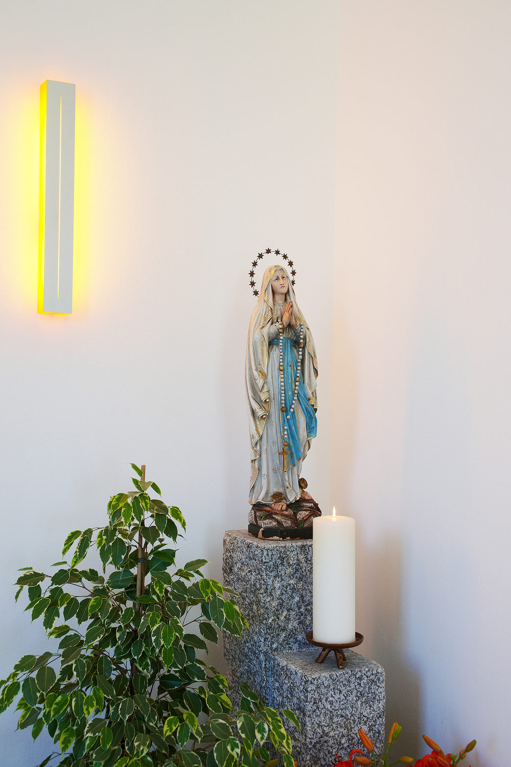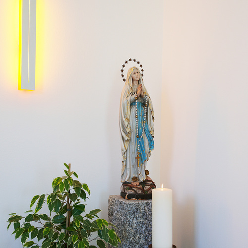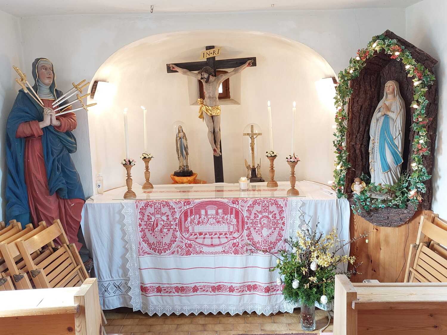 In der Kapelle befindet sich ein Altar aus Granit. Auf einem Granitsockel steht die Rosenkranzmadonna. Ein Kreuzweg mit 15 Station aus Bronze schmückt die Seitenwände.