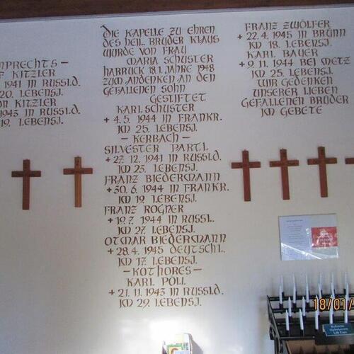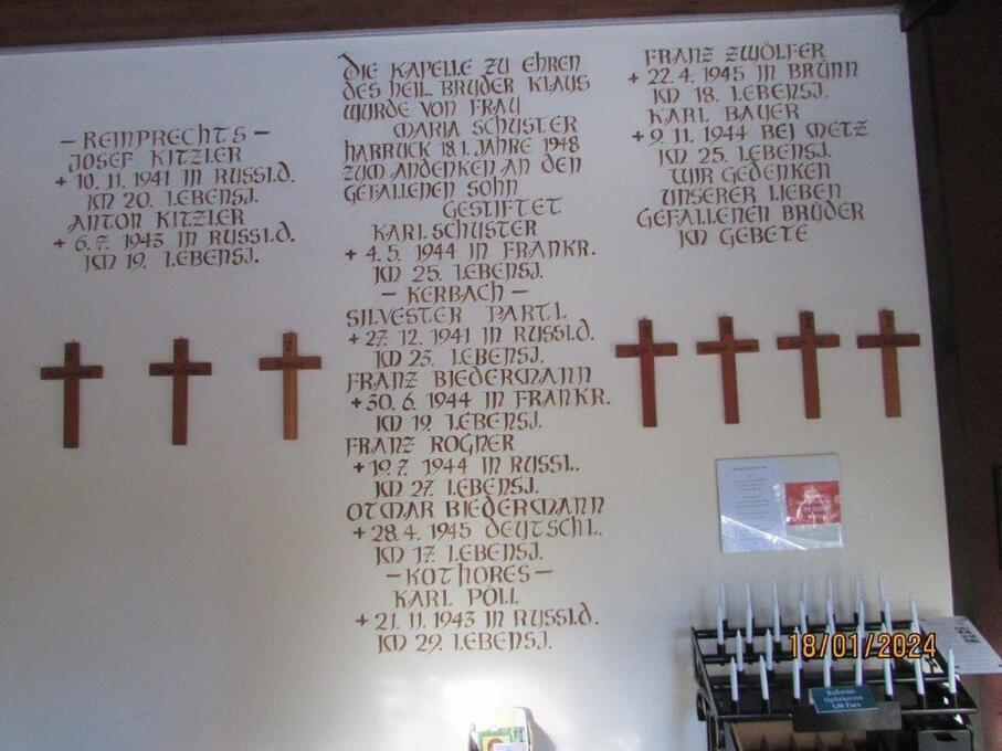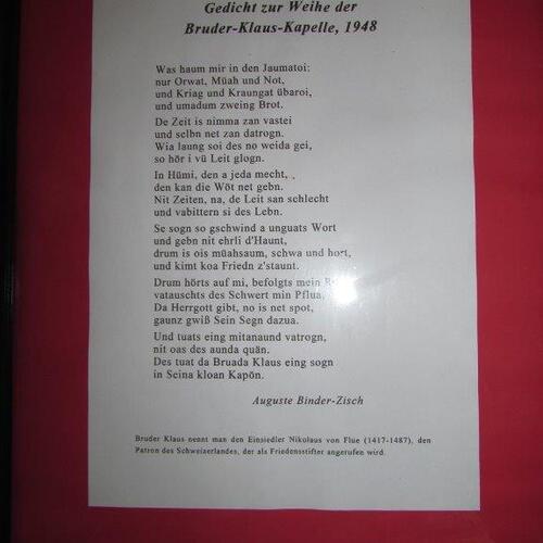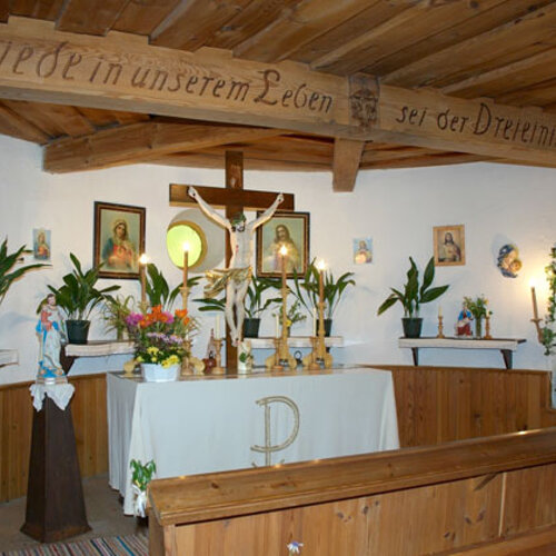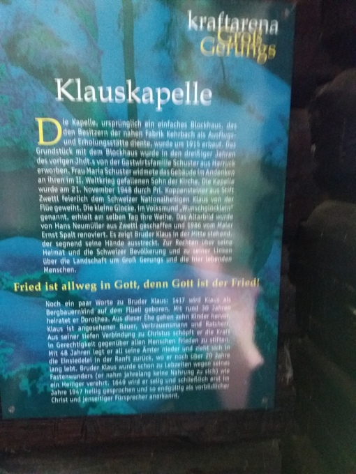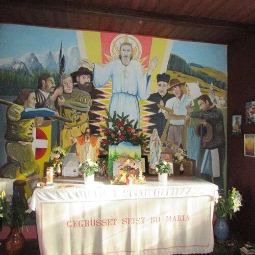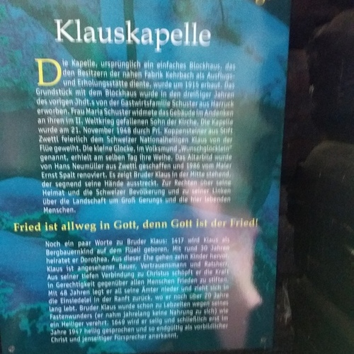 Die Kapelle war ursprünglich das Lusthaus der Gattin eines Fabrikbesitzers. 1933 wurde es vom Ehepaar Schuster aus Harruck ersteigert, welche es zum Andenken an ihren gefallenen Sohn der Kirche stifteten. Das Haus wurde 1948 in eine Kapelle umgewandelt und dem Hl. Niklaus von Flüe (Bruder Klaus) geweiht. Niklaus von Flüe (1417 - 1487) strebte nach dem Einswerden mit Gott. Er verließ 1467 mit dem Einverständnis seiner Frau die Familie, um zu pilgern. Doch aufgrund zahlreicher Visionen kehrte er um, und ließ sich nicht weit von seinem Heimatort in einem "Ranft" nieder. Freunde bauten ihm eine Kapelle und eine Klause. Die 19,5 Jahre im Ranft waren gezeichnet von einer völligen Abstinenz von Speise und Trank, einem Zeichen göttlicher Liebe, so sein Beichtvater Pfarrer Oswald Ysner. Das tägliche Gebet des Bruder Klaus: Mein Herr und mein Gott, Mein Herr und mein Gott, Mein Herr und mein Gott, |