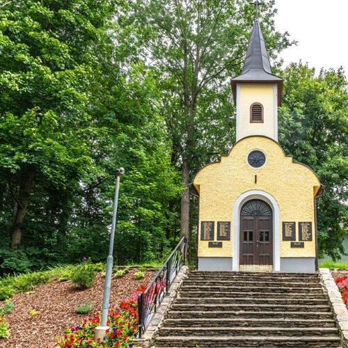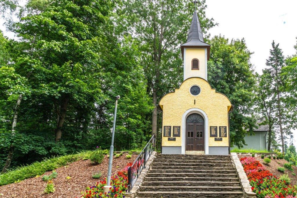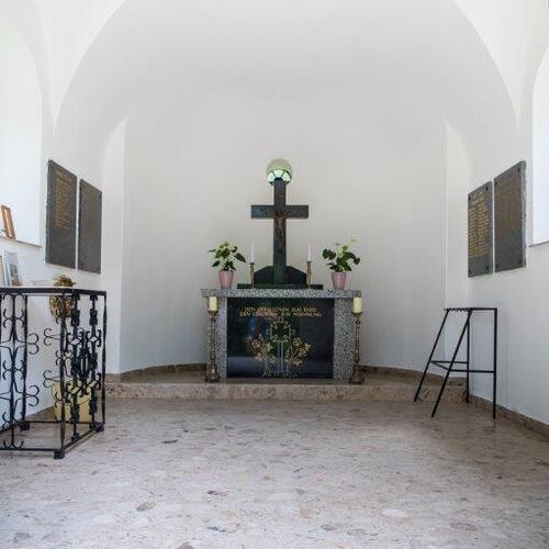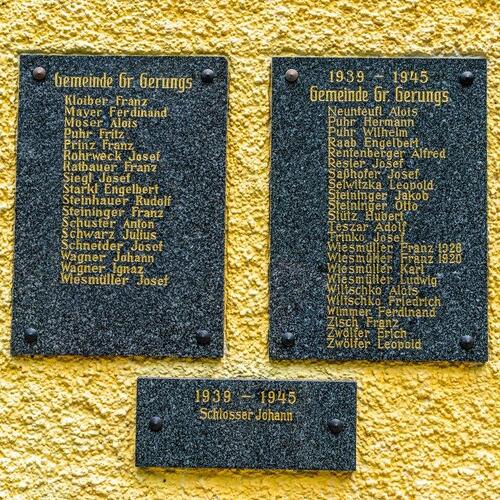 Dieses Bauwerk wurde in den Jahren 1921 und 1922 hoch über der Stadt und weithin sichtbar errichtet und im Februar 1923 feierlich eingeweiht; es diente ursprünglich als Gedenkstätte für die Opfer des I. Weltkrieges, nach 1945 wurde die Kriegerkapelle aber auch den Gefallenen und Vermissten des II. Weltkrieges gewidmet. Außen an den Wänden sind Marmortafeln mit den Namen der gefallenen Soldaten aus der Stadt und den Katastralgemeinden der Pfarre GROSS GERUNGS angebracht und im Inneren befindet sich ein sehr würdiger Altar mit dem Sinnspruch: „Den Gefallenen zur Ehre und den Lebenden zur Mahnung“. An den Seitenwänden innen hängen Christliche Andenken und Bilder zahlreicher Gefallener. Als besonderes Kleinod steht auch ein Foto des mitten im ehemaligen Schlachtfeld von STALINGRAD liegenden Soldatenfriedhofes ROSSOSCHKA mit einem Säckchen mit russischer Erde und russischem Steppengras. In den letzten Jahrzehnten wurden die Kapelle außen, der Turm und die breite Stiege, die zur Gedenkstätte hinaufführt, sowie das Innere der Kapelle durch den Kameradschaftsbund, Stadtverband GROSS GERUNGS, mit tatkräftiger Unterstützung durch die Stadtgemeinde, mehrmals renoviert und saniert, sodass sich die Kriegerkapelle in einem sehr guten Zustand befindet. Die Kameraden des Stadtverbandes marschieren traditionell jeweils am 01. November nach dem Totengedenken am Friedhof zur Kriegerkapelle und führen dort im Beisein des Stadtpfarrers und mit musikalischer Umrahmung durch die Musikkapelle eine sehr würdige Kranzniederlegung durch. Die Kriegerkapelle von GROSS GERUNGS dient – wie alle anderen Gedenkstätten auch - nicht der Heldenverehrung in einem falsch verstandenen großsprecherischen pathetischen Sinn, sondern sie symbolisiert ein Mahnmal gegen Krieg, Gewalt, Unterdrückung und Diktatur, und die Gefallenen, deren Namen in den Marmortafeln eingraviert sind, mögen die Nachkriegsgenerationen, die in Frieden, Freiheit und Wohlstand leben dürfen, gemahnen, wachsam zu sein und alles zu tun, dass sich das, was damals geschehen ist, niemals mehr wiederholen darf. Verfasst von Brigadier i. R. Franz TESZAR, Ehrenpräsident des Kameradschaftsbundes NÖ und Ehrenmitglied des ÖKB- Stadtverbandes GROSS GERUNGS im August 20 |