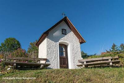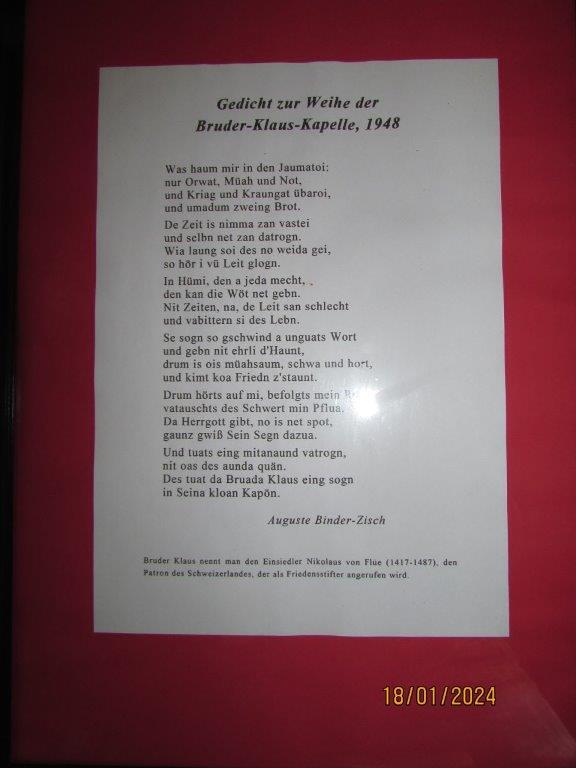 „Die Besitzerin des Blockhauses bei der Klausmühle Frau Maria Schuster, Harruck, hat dieses im Andenken an ihren gefallenen Sohn Karl Schuster für kirchliche Zwecke gestiftet. Der Ortspfarrer Anton Hofbauer hat im Spätherbst 1948 die Umwandlung des Blockhauses in eine Kapelle veranlasst. Viele packten zu, besonders die Jugend von Kl. Reinprechts. Das Altarbild schuf Malermeister Hans Neumüller aus Zwettl. Den Altar erbaute Tischlermeister Franz Höbarth, Groß Gerungs. Die Kapelle wurde am 21.11.1948 vom Hochw. H. Prälaten Bertrand Koppensteiner v. Stift Zwettl eingeweiht. Die Festpredigt hielt Pfarrer Rippl von Marbach/Wald. Die Glockenweihe vollzog Herr Dechant P. Josef Leutgeb. Glockenpatin: Frau Aloisia Hirsch, Gastwirtin Gr. Gerungs Patenschart über die ganze Kapelle: Frau Maria Schuster, Harruck, die Stifterin. Auf Initiative von Herrn Rudolf Hirsch Gastwirt wurde 1986 die vielbesuchte Klauskapelle renoviert. Den Firmen Zahrl (Dachdecker), Winter (Eingangstür), Eschelmüller (Schrift), Bauer- Mitterlehner (Streicharbeit), Zauner (Holzarbeiten), Herr H. Weis spendetet das Kreuz über der Eingangstür, Herr Ernst Spalt frischte das Altarbild auf. Allen nochmals herzlichen Dank. Am 9. August 1986 war die Wiedereröffnung der renovierte Bruder Klaus Kapelle. Seither ist jedes Jahr dort am 14. August eine Abendmesse mit anschl. gemütlichem. Beisammensein. Fest des Hl. Bruder Klaus: 25. September Das Gebet des Heiligen steht über den 2 Fenstern (rechte Seite) der Kapelle. |