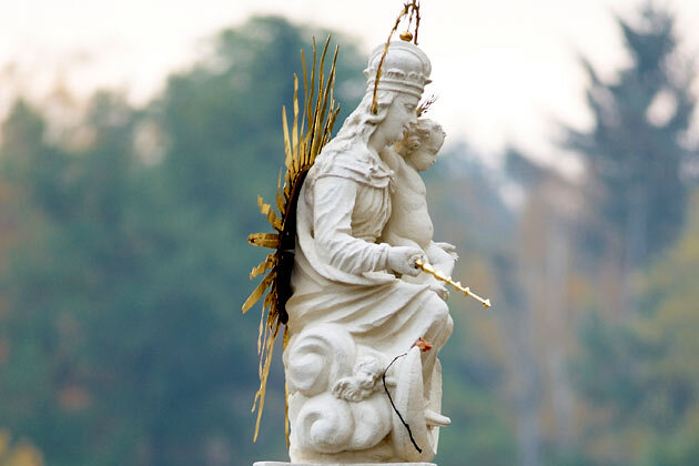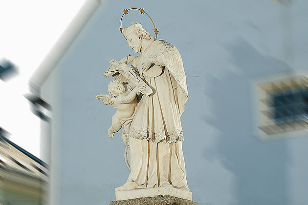 Johannes "ne Pomuk" (1345 - 1393), aus Pomuk war ab 1389 Generalvikar des Erzbischofs von Prag. Sein energisches Auftreten für die Rechte der Kirche gegenüber dem König und seine Predigten machten ihn beim Volk berühmt und dem König lästig. Einer anderen Überlieferung zufolge soll er der Beichtvater der Königin gewesen sein. Als er sich den Anordnungen des Königs, das Beichtgeheimnis zu brechen, widersetzte, ließ dieser ihn foltern und schließlich in der Moldau ertränken. Durch ein Wunder - die Königin hatte eine Erscheinung von fünf Sternen, die den Fundort der Leiche offenbarte - wurde der Tote geborgen und beigesetzt. |
