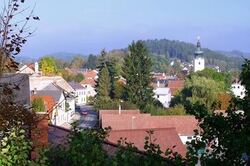 Die durch den mächtigen Chorturm mit Zwiebelhelm und offener Laterne weithin sichtbare Pfarrkirche steht in der Ortsmitte südlich des Hauptplatzes. Der Platz rund um die Kirche war ehemals Friedhof, der 1818 aufgelassen wurde und an den heute noch einige Grabsteine im Chorbereich außen erinnern.